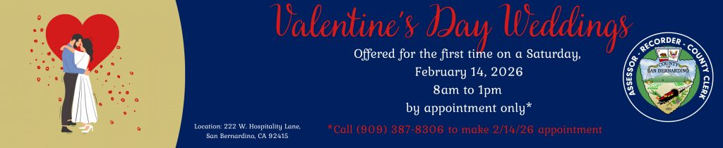 The San Bernardino County Recorder-Clerk’s office issues marriage licenses and performs marriage ceremonies.